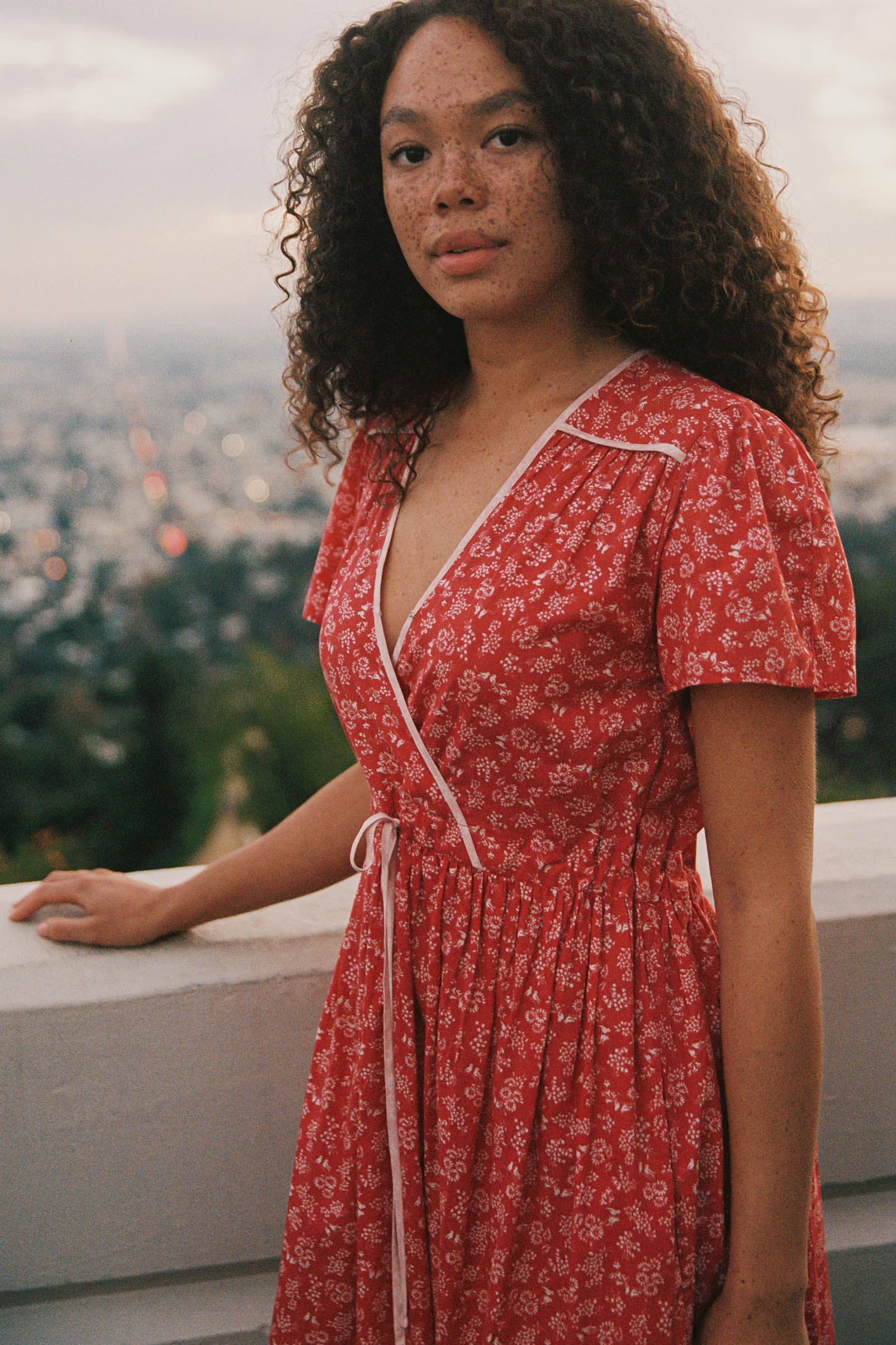 - Robin Blossom is made with a floral ditsy print of two birds perched on a red ground